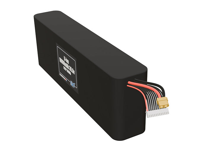 Front-facing render of the 39.6V 10000mAh 11S2P Li-ion battery, assembled in the USA by maxamps, for drone and robotics applications.