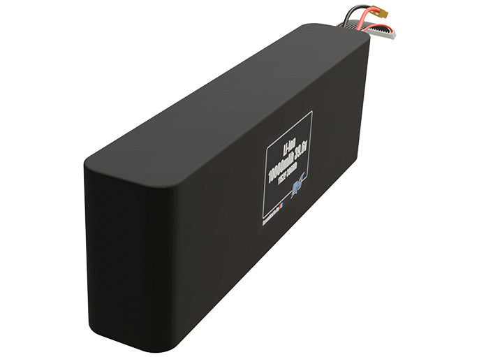 Angled product render of the 10000mAh twenty-two-cell Li-ion pack. A lightweight energy source for UAV, drone, and robotic builds.