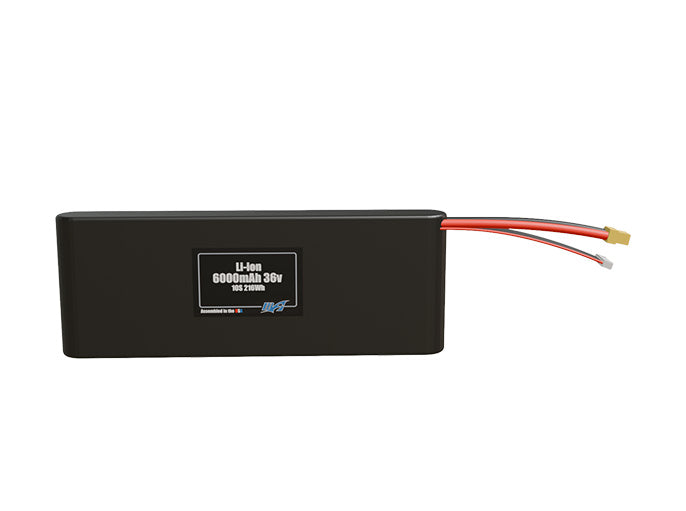 Compact 36-volt 6000mAh lithium-ion battery, built for lightweight drone, UAV, and robotics projects.