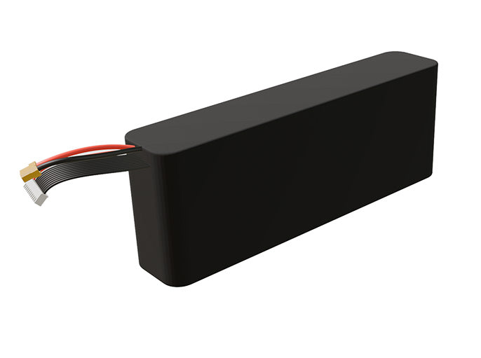 Angled product render of the 9000mAh twenty-cell Li-ion pack. A lightweight energy source for UAV, drone, and robotic builds.