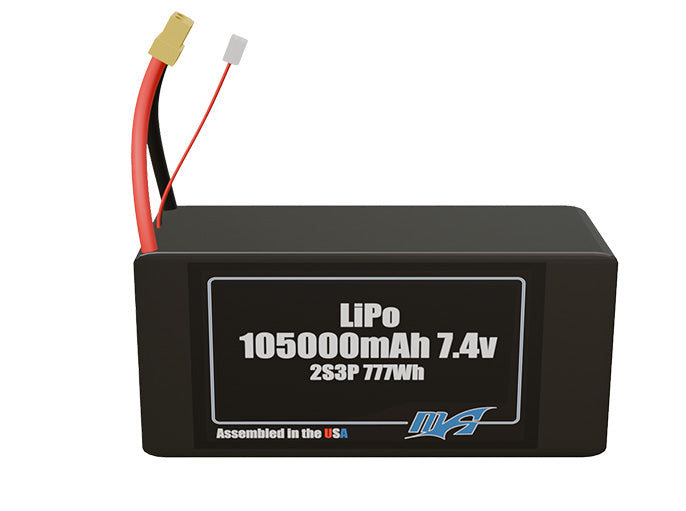 Side-angle render of a 7.4-volt 105000mAh lithium-polymer battery, assembled in the USA for compact UAV, drone, and military robotics platforms.