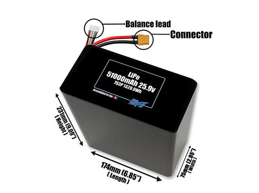 These MaxAmps LiPo batteries are 51000mAh (milliamps) or 51Ah in capacity. As with all our LiPo pouch batteries, they are assembled in the USA by our Battery Builders here at MaxAmps.