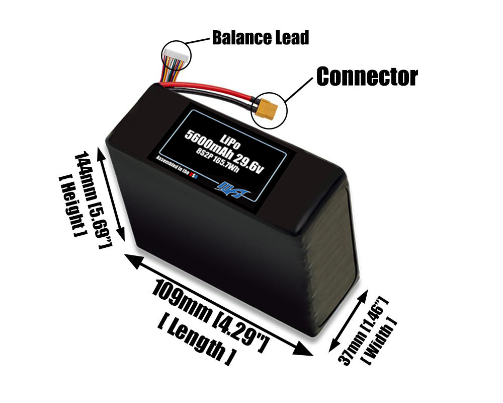 Front-facing render of the 29.6V 5600mAh 8S2P LiPo battery, assembled in the USA by maxamps, for drone and robotics applications.