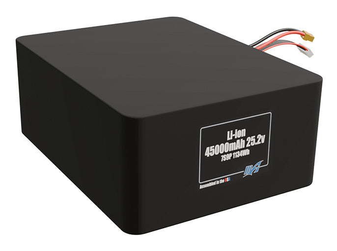 Side-angle render of a 25.2-volt 45000mAh lithium-ion battery, assembled in the USA for compact UAV, drone, and military robotics platforms.